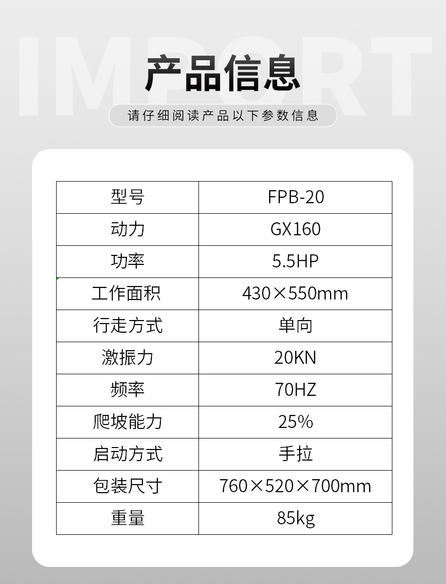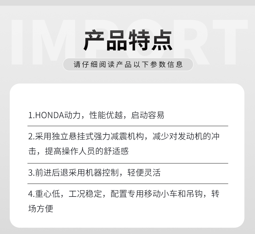 適用于路基邊緣、橋涵、管道、溝槽底部等狹長地帶的壓實。 本田汽油動力,名牌品質(zhì)保證。